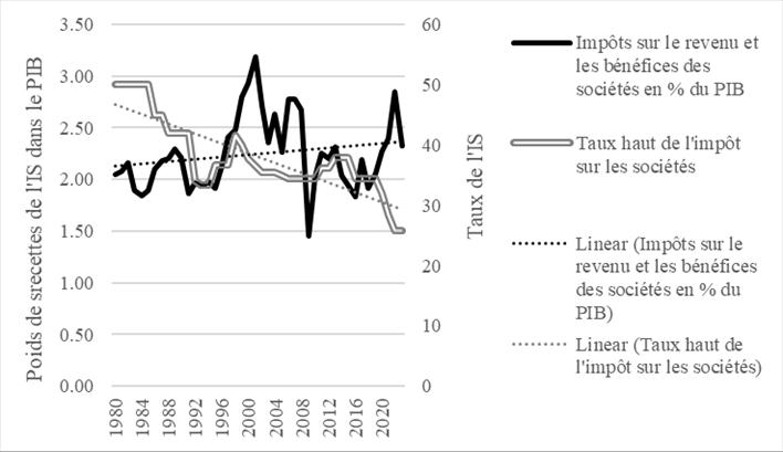 Baisse des taux de l’impôt sur les sociétés et poids des recettes de l’impôt sur le revenu et les bénéfices des sociétés dans le PIB