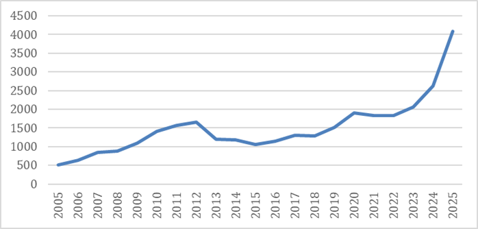 Cours d’une once d’or en Dollar de 2005 à 2025